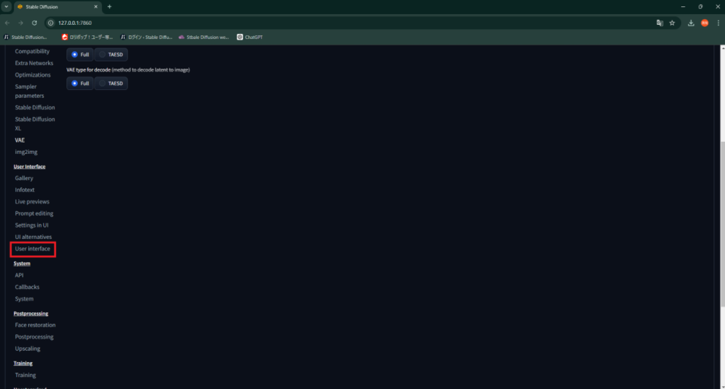 次に画面左サイドバーにある赤枠に示した「User Interface」をクリックしてください。
