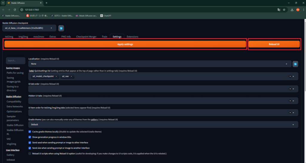 「Apply Settings」をクリックして設定内容を保存し、「Reload UI」をクリックしてWeb UIをリロードします。